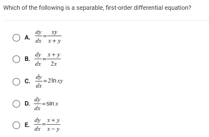 In this answer we do not restrict ourselves to elementary functions. Which of the following is a separable first-order differential equation. The dependent variable is y y y.